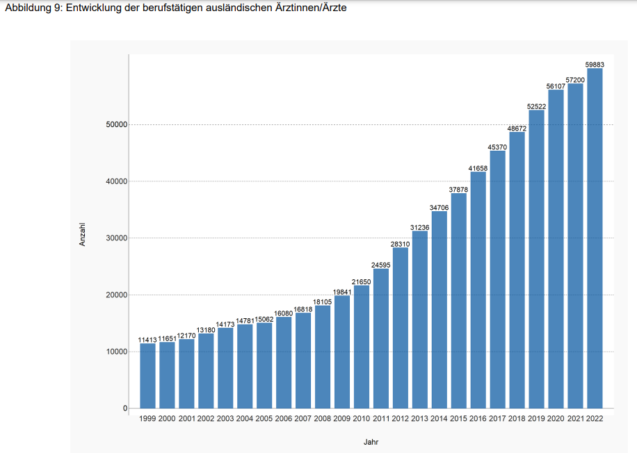 حسب إحصائيات نقابة الأطباء المركزية الألمانية، بلغ عدد الأطباء الأجانب في ألمانيا في عام 2022 رقم 59833 طبيب وطبيبة. للمقارنة، كان هذا الرقم عام 2013 هو 31236 أي بزيادة قدرها 191.6%.