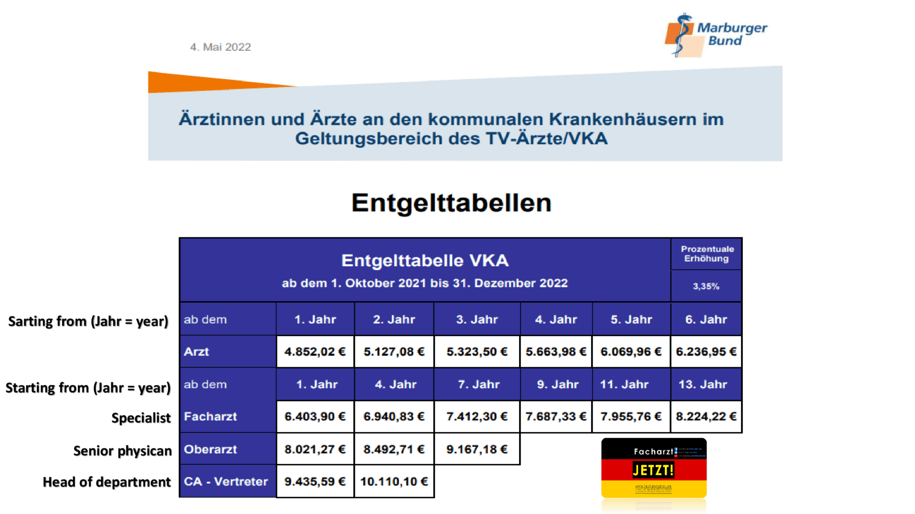 Gross salary is before taxes and insurance (health, pension, unemployment, etc.). In German, it is called “Brutto”. For example, a resident doctor in the first […]